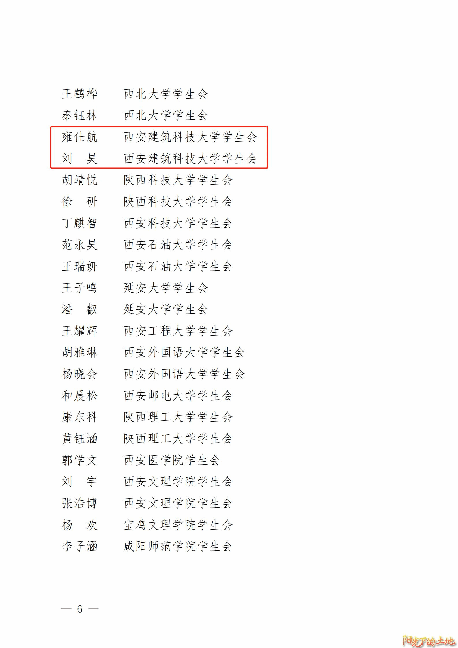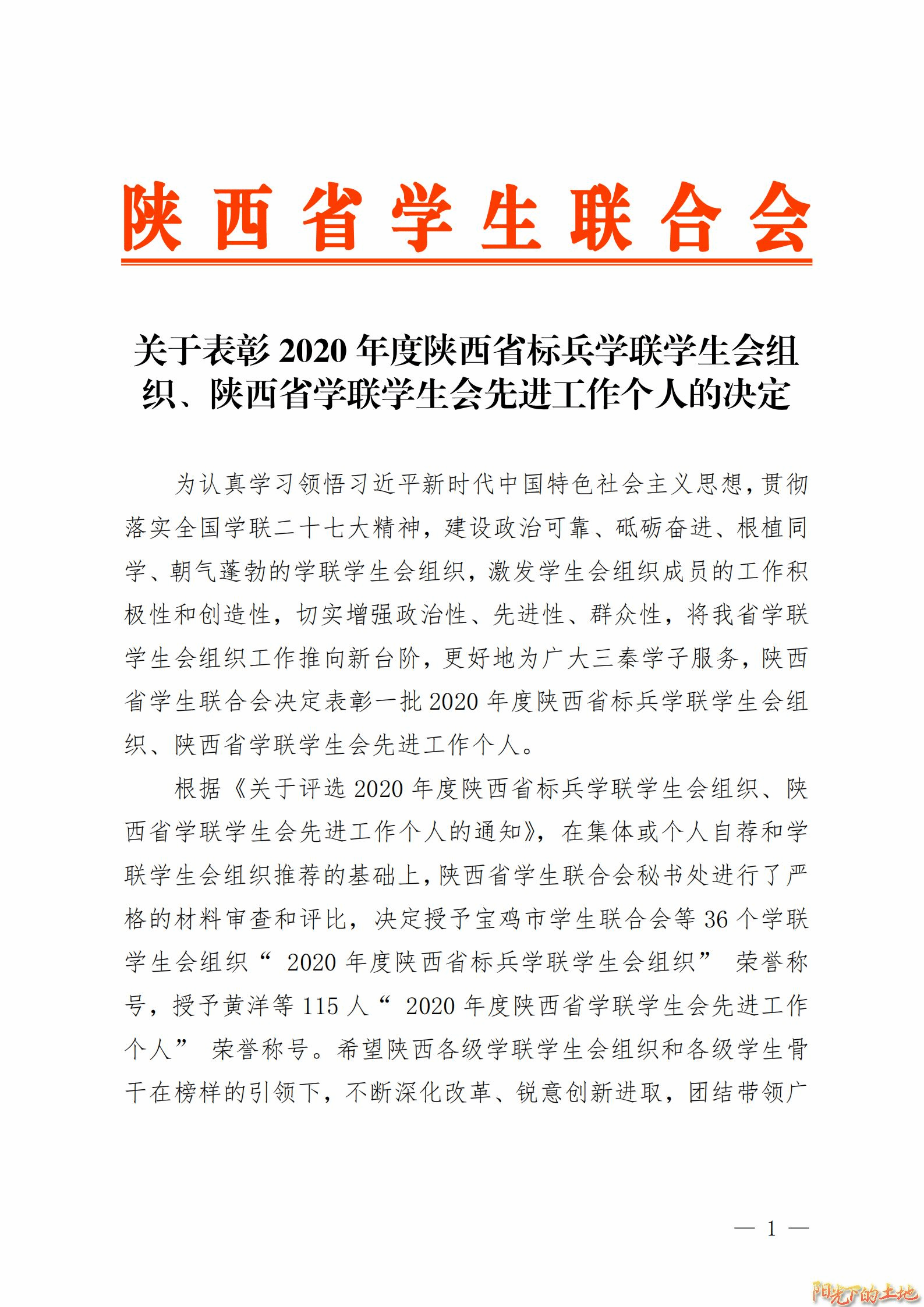建大团委网讯 12月20日,陕西省学生联合会第十届委员会第四次全体会议在西安召开。大会通过了《关于落实陕西省学生联合会对陕西各级学联学生会组织指导管理的若干规定》《陕西省学生联合会考核、奖励、责任追究制度》,选举产生了陕西省学生联合会第十届第四任主席,表彰了2020年度陕西省标兵学联学生会组织和陕西省学联学生会先进工作个人。我校学生会和研究生会同时获得“2020年度陕西省标兵学联学生会组织”荣誉称号,我校学生会干部刘昊、雍仕航和研究生会干部冯雪益、郑书昌获得“2020年度陕西省学联学生会先进工作个人”荣誉称号。
