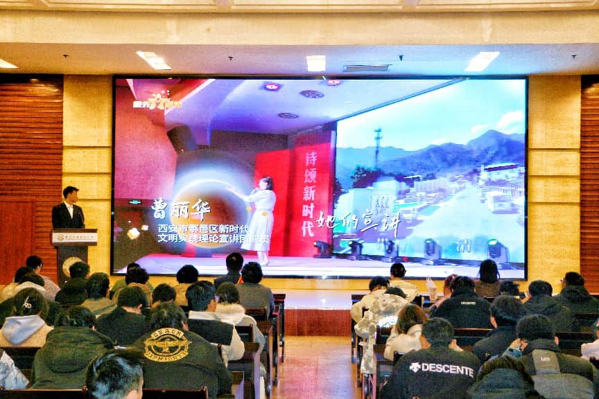 历史与当代的碰撞,穿梭于古今长安,驼铃阵阵的古丝绸之路到奔腾不息的“长安号”,浩浩荡荡的古代商队到高效便捷的现代政务服务。西安市新时代文明实践理论宣讲团成员连萌、刘冬雪以《月下长安:古今时空的交响与传承》为题,通过时空对话的形式,展现着西安开放包容、奋斗传承的城市精神,让师生对文明的传承有了更深刻的理解。