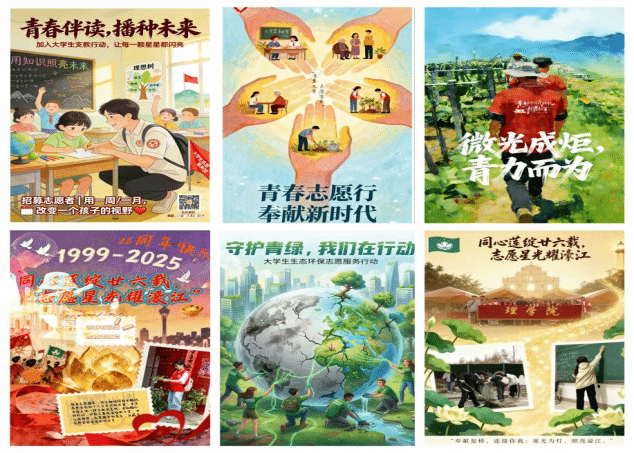 环境与市政工程学院举办“AI赋能,益暖人间”创作活动,鼓励学生以AI工具创作志愿服务主题内容,以数字形式讲述志愿故事。机电工程学院组织“AI绘志愿・创意传公益”海报设计评比,将志愿精神转化为可视化作品,展现青年学子对公益内涵的理解与表达。公共管理学院开展“公管智萃”科普宣讲,运用AI工具生成多主题图片素材,探索“AI+志愿”新模式,为志愿服务注入信息化动能。