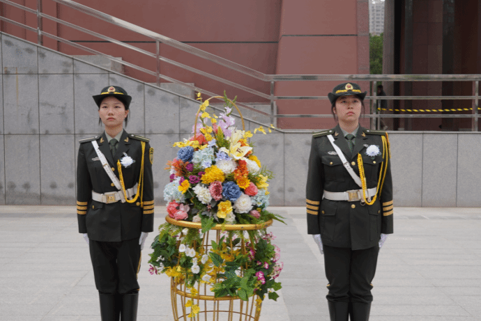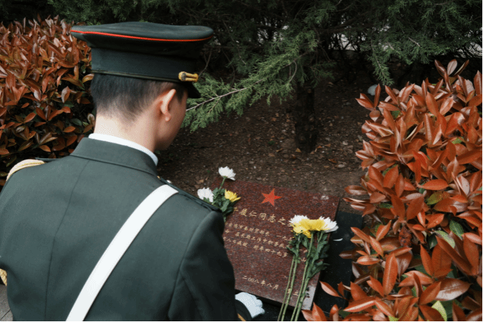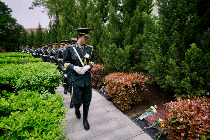 国旗护卫队队员步伐刚健,郑重地向烈士墓敬献花篮。一朵朵素洁的菊花,承载着后辈对革命先辈最深沉的祭奠与追怀。