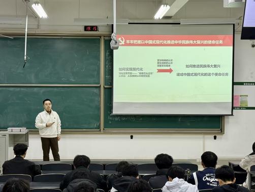 在此次宣讲中,李虎老师进行了题为《以中国式现代化全面推进中华民族伟大复兴》的宣讲。他从“中国式现代化道路的形成”引入,结合党领导人民完成脱贫攻坚的伟大成就深入浅出地讲述了“中国式现代化的中国特色”的具体内涵。李虎呼吁全体同学要发扬历史主动精神,通过“两个一百年”奋斗目标的演进,清楚认识到不断向前推进的历史使命,把个人成长与中国式现代化的实践要求绑定,以理论认知为根基、从专业领域践行担当,在时代发展中找准青春坐标。