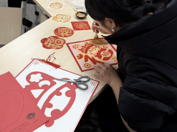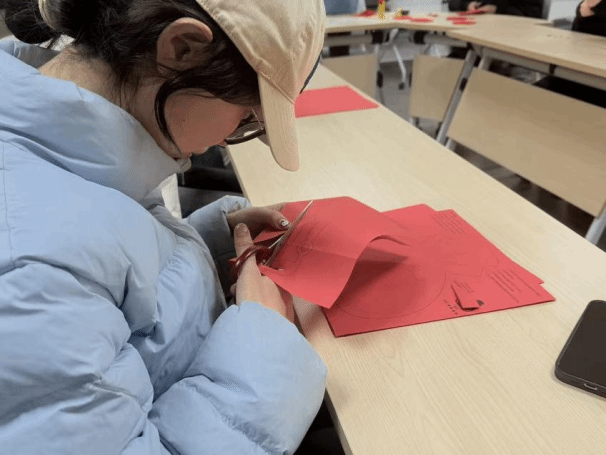 在剪纸体验环节,同学们从折叠到剪裁逐步尝试,纸屑翻飞间,一幅幅寓意吉祥的图案逐渐成形,展现出剪纸艺术的简洁与精巧。过程中,大家互相交流技巧、分享创意,现场氛围轻松。