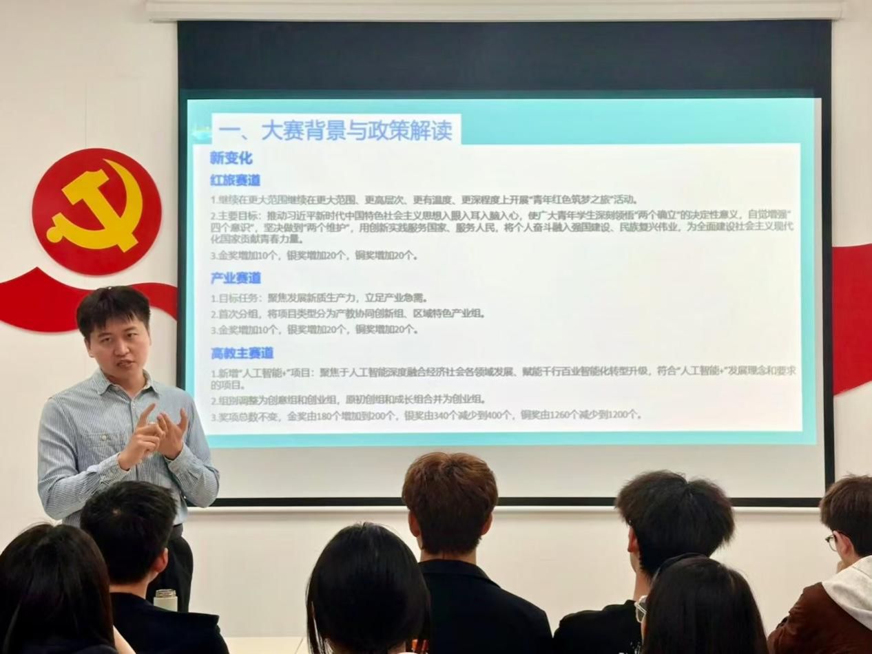 随后,邵振浩围绕赛事核心内容展开全面细致的讲解,结合共青团服务青年创新创业的工作重点,从参赛报名、团队组建、项目选题、申报书撰写,到赛程节点把控、备赛策略规划、参赛注意事项等全流程内容,逐一进行深入解读,针对性解答团员青年在参赛筹备过程中遇到的困惑与问题。讲解内容紧密贴合青年学生学业与实践需求,兼具专业性与实用性,为团员青年清晰指明了参赛路径与备赛方向。