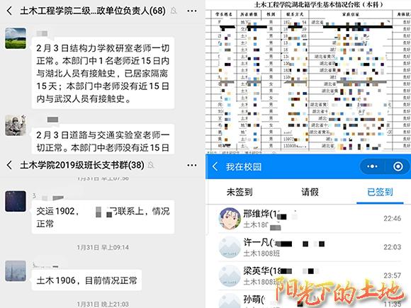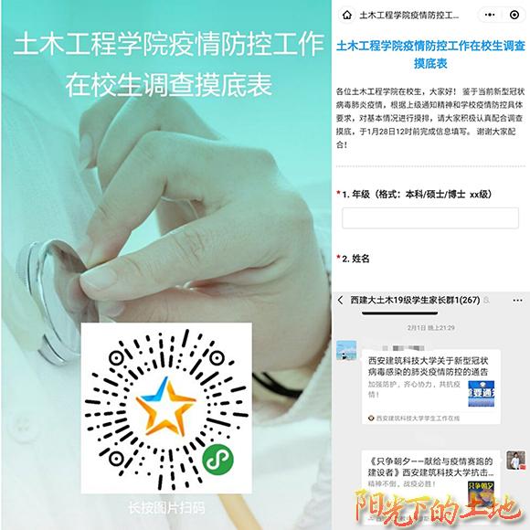 运用网络技术制作《土木工程学院疫情防控工作在校生调查摸底表》电子问卷,全面细致开展疫情摸排自查,动态掌握学生身体健康状况;利用“家长群”“生活群”“校友群”广泛告知学校、学院疫情防控工作通知与要求,统筹监督合力;充分发扬党员、团员先锋作用,确立支部书记负责制,严守政治纪律、工作纪律,坚决保证政令畅通,杜绝迟报瞒报、敷衍拖拉。