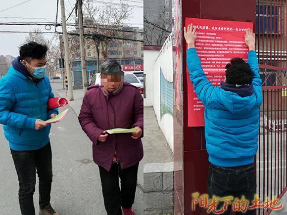 习近平总书记指出,社区是疫情联防联控的第一线,也是外防输入、内防扩散最有效的防线。为了增强社区群众对疫情防控工作的理解与支持,土木1803班吴嘉新同学一回到家乡便跟随社区网格管理员们一起,走向街头与各居民区楼道,发放疫情防控宣传单、张贴通告并普及日常防护知识。在不断努力下,他完成了武汉返乡人员排查登记8人,张贴公开信4封,发放宣传资料110张。在他看来,疫情防控宣传工作是群防群控工作的重要组成部分,很辛苦但是很有价值。吴嘉新呼吁:“希望大家多多支持劝返员、宣传员的工作,为他们送上一壶热水,为他们在寒风里的坚守点赞加油,我们一起努力。”