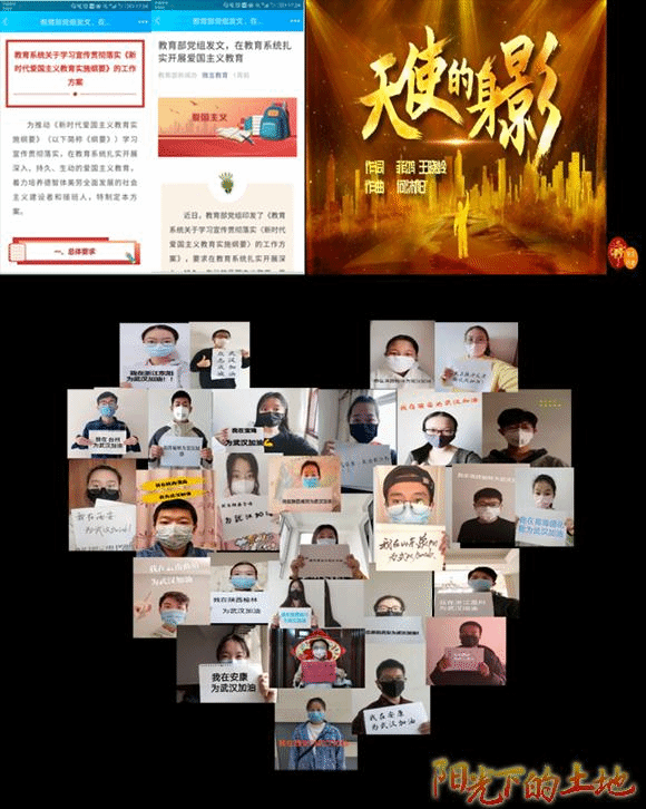 在开展“敬畏·感恩·责任”教育过程中,各班级结合“雷锋月”活动,号召同学们开展志愿活动,为祖国疫情防控分忧。同时辅导员、班主任学习熟悉《新时代爱国主义教育实施纲要》,将抗击疫情与爱国主义教育贯通起来。他们结合视频、新闻、感人事迹进行分享,在观看《天使的身影》短片中,应数1902班杨昊同学感叹道:“同样是00后,昨天他们可能还是父母眼中的孩子,今天换身行装,学着前辈的模样负重前行,这才是中国青年的样子!”此外,同学们还纷纷亲自动手制作图片,“笔”援武汉,献上了自己对武汉的祝福。