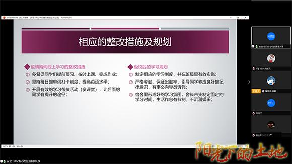 接着,各班学习委员学分别从班级同学对线上学习的适应度、学习状态、学习进度以及学业帮扶活动开展情况等方面作了分享,交流了线上学习目前存在的一些问题和改进措施。线上学习三周以来,同学们基本都已熟知各门课程的上课平台和操作方法,能够合理安排作息时间,按照任课老师的要求完成学习任务。但也有个别同学还未完全适应,存在上课迟到、课前预习不到位、作业提交不及时等问题,学习自律性和相关管理制度的落实还有待加强。