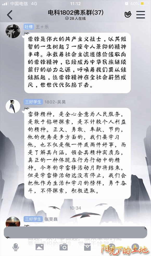 为帮助同学们普及有效的疫情防控措施,同时缓解焦虑紧张情绪,工力1801团支书分别以“QQ论坛”和“线上学习”的方式来引导团员青年进行学习,鼓励大家学习“逆行者们”的中国精神,积极开展“学雷锋,献爱心”实践行动。比如参加一次志愿服务活动、给自己定一个学习目标、为家人做一件力所能及的事情等。工力1802团支书进行了雷锋精神授课。邹家华同学表达了志愿活动感想:曾经,都是父母为我们做饭,在家里打扫卫生。我们长大了,要多帮他们分担家务,学家的味道,帮助父母做一下饭。我们要见贤思齐,把雷锋精神代代传承下去。”