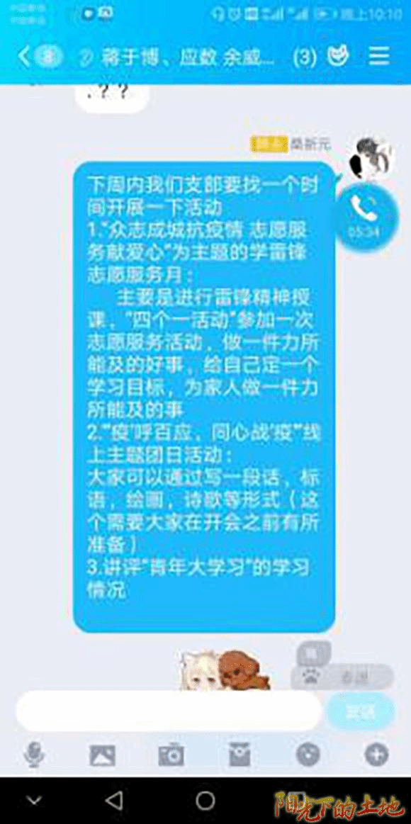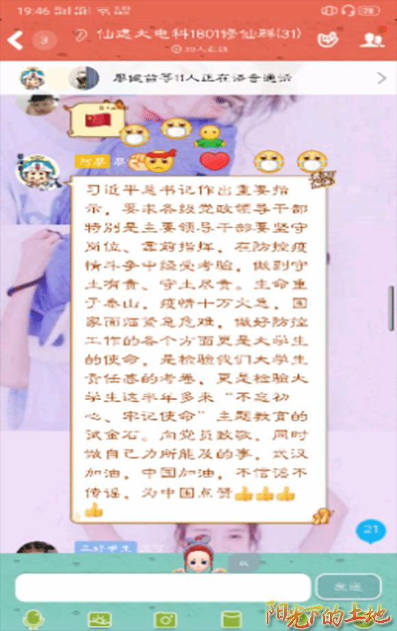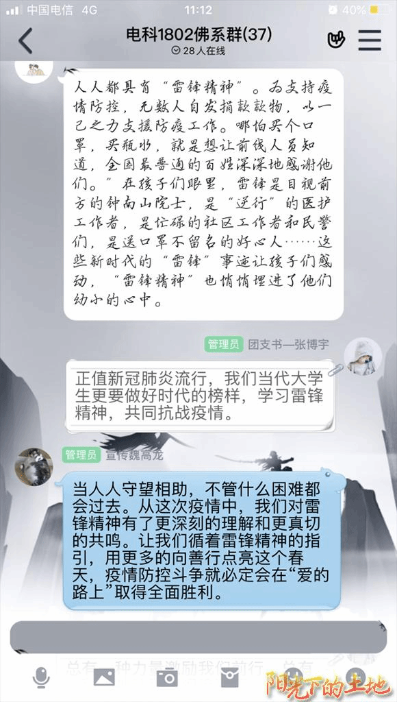 本次线上会议由电科1801团支书郑乐主持开展,活动内容为各宿舍代表以“众志成城抗疫情,志愿服务献爱心”为主题发表自己的看法。在抗疫期间,也有不少同学带好口罩,做好防护,走上志愿服务的岗位,为这场战役贡献自己的力量。团支书张博宇主持召开此次会议,突如其来的新冠病毒打破了我们原本热闹、繁华的春节生活,拉开一场无声战“疫”,有人逃离,就有人逆行。在这场战“疫”中,每个志愿者都是我们身边的“雷锋”。同学们感言到:面对巨大的灾难我们当代大学生更要做好时代的榜样,学习雷锋精神,共同抗战疫情,为祖国尽一份力,认真学习网课。武汉加油!中国加油!我相信我们一定能战胜此次疫情,待春暖花开,一起踏春赏樱。