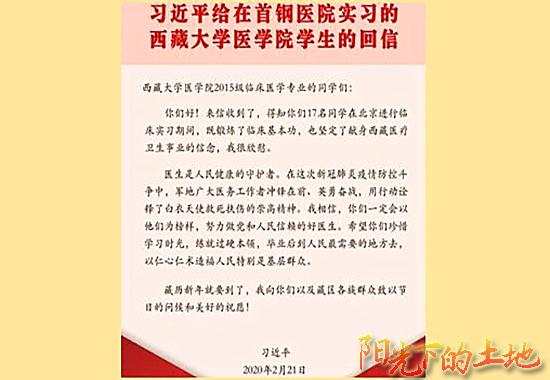 《习近平给在首钢医院实习的西藏大学医学院学生的回信》