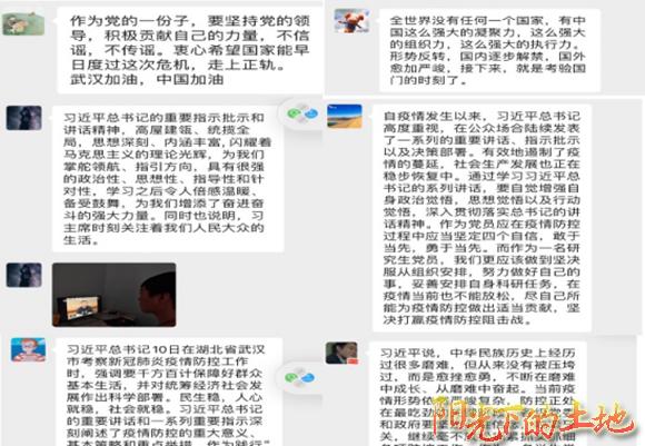 部书记强调,我们身为学生党员虽不能在一线抗“疫”,但是我们可以在家努力学习、做好科研,不给国家防疫工作增加负担,为战“疫”做出自己的贡献。在完成系统学习后,支部书记组织支部成员们通过微信交流群发表了自己的学习心得。支部成员们的发言都真挚地表达出了对祖国的浓浓热爱之情,并表示会紧跟学院党委步伐,坚定信念,咬紧牙关,积极地承担起自己的责任与义务,坚决打赢此次的疫情防控阻击战。