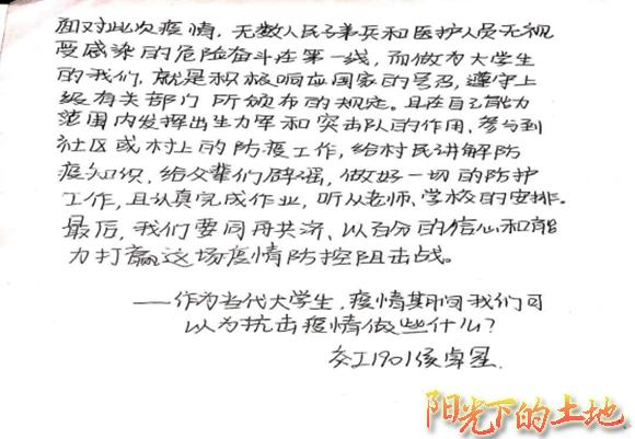 交工1901团支部的侯卓星同学为此次疫情写下了自己诚挚的话语。字里行间字字恳切,陈情其间,满怀对疫情的关心。这不仅仅是一封疫情“陈情表”,更是建大土木学子对祖国的表白。