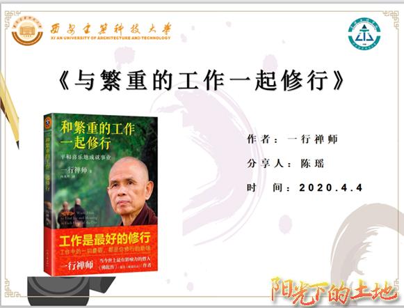第一位分享者是矿业工程18级的陈瑶同学,他分享的书籍是《和繁重的工作一起》。分享中,她指出很多人常常抱怨工作、学习辛苦、事事不顺,甚至讨厌上班、学习,自己也有这方面的经历。其实,工作学习的压力和挫折,恰好是自我修行的最好机会。首先她讲到修行正念,即无论做什么事,在什么时候都要集中注意力,即使是呼吸,吃饭也要集中注意力生活的每时每刻都可以修行正念。接着她提出要学会放松,无论是工作时间还是学习时间我们都可以放松,无论你身处什么样的境遇,遇见什么样的人,一切都是在训练你的心性。哪怕是面对一场无缘故的非议,或者填一份繁琐的报表,你都要在这样的事情面前,学会调适自己的内心。最后,强调平和喜乐的成就事业,能少一些抱怨,多一些自省;少一份烦躁,多一份从容。