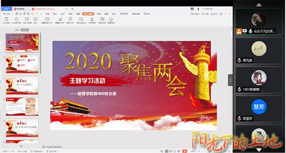 建大团委网讯(通讯员 管理学院研1903党支部) 为进一步深化学习两会精神,鼓励同学们关注国家大事,与时俱进,展现新时代学生的精神面貌。管理学院研1803党支部于2020年5月27日下午14时通过腾讯会议召开学习两会精神思想交流会。本次会议由党支部书记吴静怡主持,支部全体成员参加。