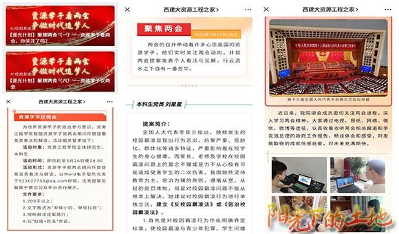 建大团委网讯 5月21日—28日,全国两会隆重召开。为深入学习宣传贯彻全国两会精神,引导广大资源学子深刻领会、准确把握两会精神实质,资源工程学院以学生党支部和学生组织为依托,面向全体资源学子开展了学习宣传贯彻全国两会精神系列活动。