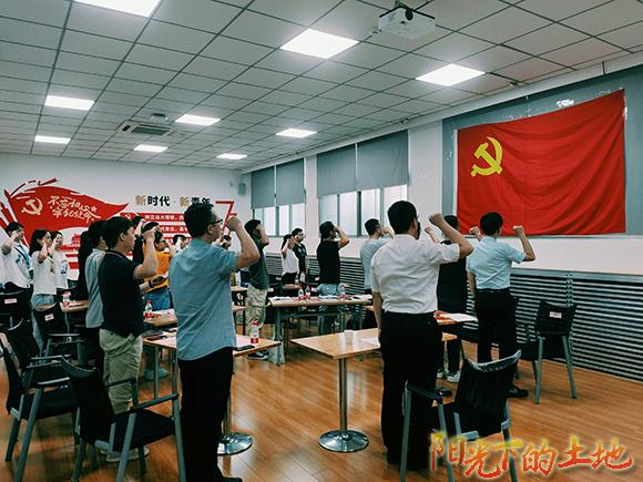 党旗下,全体同志肃然起敬,举起右拳,重温入党誓词,声声话语表初心,句句誓言明决心。