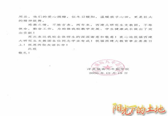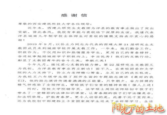建大团委网讯(通讯员 王木悦 张愉乐)2019年9月,西安建筑科技大学第21届研究生支教团来到北依秦岭、南靠巴山的洋县。“人,最爱做的事情就是回头看,看了一圈发现只有遗憾和惋惜,可是当你再次回头之时,会发现早已满载而归。”回首望去,支教生活便是如此。支教团成员们将自己奉献给社会,以行动践行青年人的担当,用赤子之心去点亮那些孩子的世界。支教团在时光中雕刻了爱的痕迹,洋县用真诚留下了盈盈爱的回忆。近日,我们收到了来自洋县城南九年制学校的感谢信,字字含情,言语间是感激是祝福,同时也是对研究生支教团奋斗与奉献的勉励。