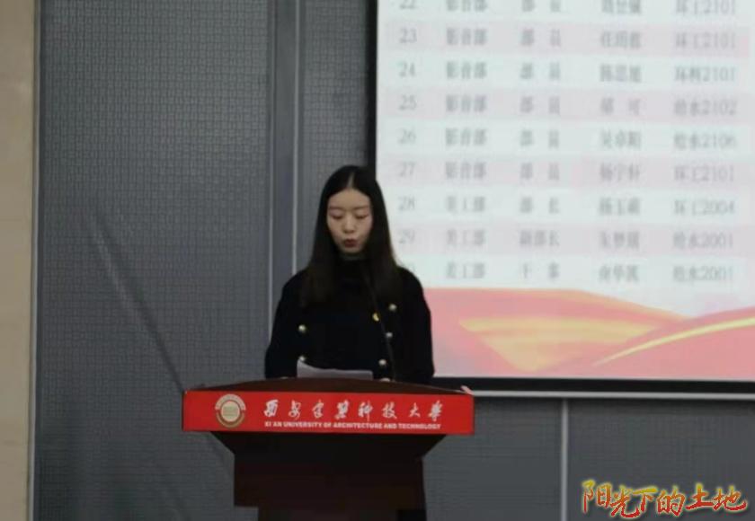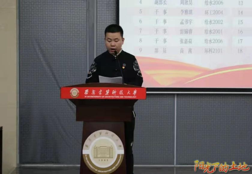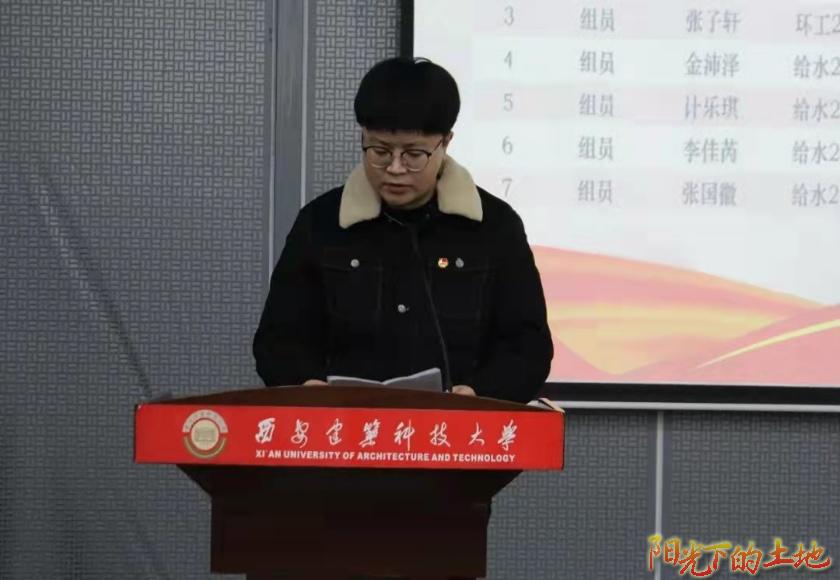 建大团委网讯 为了推动我院团学组织建设,促进团学工作进一步发展,提高学院团学组织学生干部的工作热情、基本素质和综合能力,环境与市政工程学院于2021年11月3日晚,在草堂校区学府城6-301教室举行了2021-2022届团学组织聘任大会。环境学院党委副书记、副院长郑成华,学工办主任、博士生辅导员冯永宁,团委书记、2018级本科生辅导员辛欣,团委副书记、2019级硕士生辅导员魏旖旎,团委副书记、2020级本科生辅导员李力,2021级硕士生辅导员周猛,2019级本科生辅导员薛福举 李力老师宣读名单,2021级本科生辅导员李恺弘、苏倩,及2021-2022届团学组织成员参加本次大会。会议由给水2106班翟雨轩同学主持。