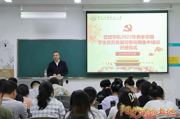 建大团委网讯(通讯员 平谨华 王子豪)为扎实做好党员发展工作,引导党员发展对象提升理论水平、坚定理想信念、端正入党动机,4月25日晚,管理学院在学府城13栋205举行2022年春季学期学生党员发展对象短期集中培训开班仪式。管理学院党委副书记、副院长李欣军,学生工作办公室主任周琳,团委副书记葛亮、柴康,研究生辅导员吴静怡,本科生辅导员陈雷以及全体学生党员发展对象参会。会议由院团委书记平谨华主持。