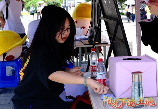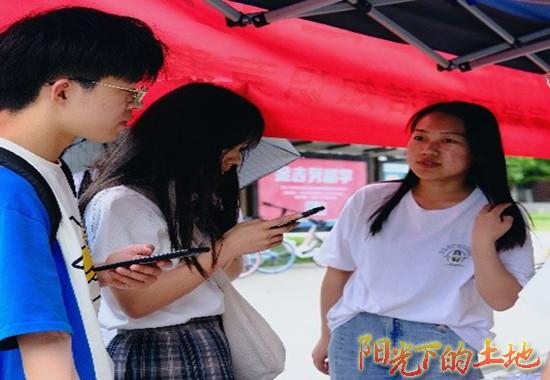 工作人员耐心地向同学们介绍本次活动内容,同时为每位参与活动的同学发放印有学校景观的明信片留作纪念。同学们参与的热情宛如这炎炎夏日般强烈,各个答题点都围满了参与答题的同学。