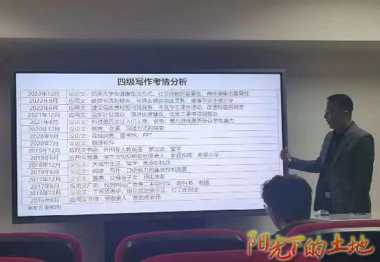 老师首先介绍了四级考试除听力外的命题结构及分值设置,明确得分重点,同时对四级写作翻译考情也进行了分析。针对同学们存在的问题,专门讲授了答题中的一些“小窍门”,帮助同学们更好掌握学习英语答题方法,随后分写作部分和翻译两个部分讲解了四级主观题目中的常见词句,要求同学们熟悉翻译常考词,做到单词拼写不出错。了解写作模板句式,做到言之有物,善用长句。明确临考前学习任务,有效应对本次英语四级考试。