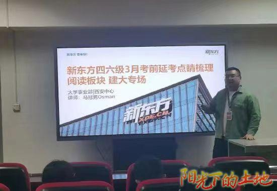 为进一步夯实四级专项基础,提升同学们的阅读速度和水平,提升阅读能力,环境学院于3月6日19:00-21:00在环工楼512会议室特邀新东方大学事业部马冠男老师开展题为《四六级3月考前延考点睛梳理-阅读板块》的专题讲座。