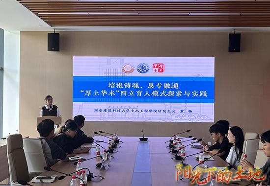 西安建筑科技大学土木工程学院研究生会成员黄畅围绕大思政背景下学生组织如何在做好思想引领和价值塑造方面贡献力量展开讲解,并且介绍了“厚土华木”四立育人模式的实践探索——以厚植立德为前提,土培立学为基础,华育立志为核心,木撑立业为目的,通过实践活动服务学子。展示了我院学生组织服务青年、树立典型等活动的开展理念。