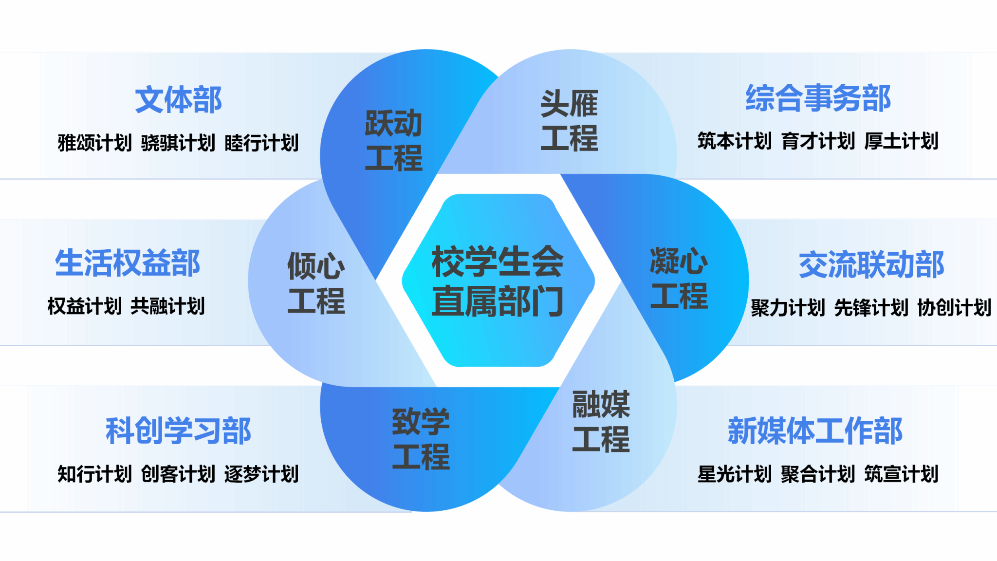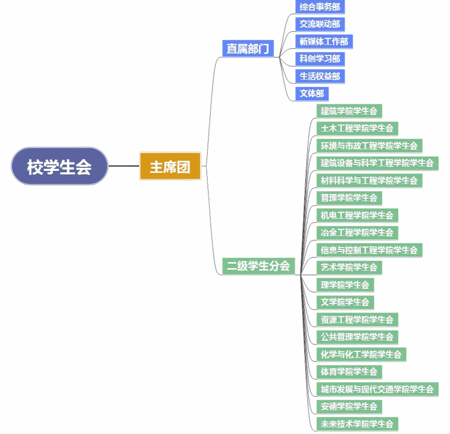 西安建筑科技大学学生会是学校党政部门与学生之间相互沟通的桥梁和纽带,由主席团、直属部门、二级学生分会组成。直属部门现设综合事务部、交流联动部、新媒体工作部、科创学习部、生活权益部、文体部共六个部门,二级学生分会共19个。